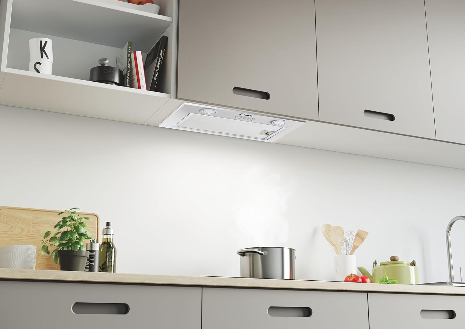- Integra la campana extractora a tu cocina con un diseño que pasará desapercibido: escoge entre una instalación de extracción o recirculación. La recirculación se aconseja en espacios que no tienen el hueco que conduzca al exterior.